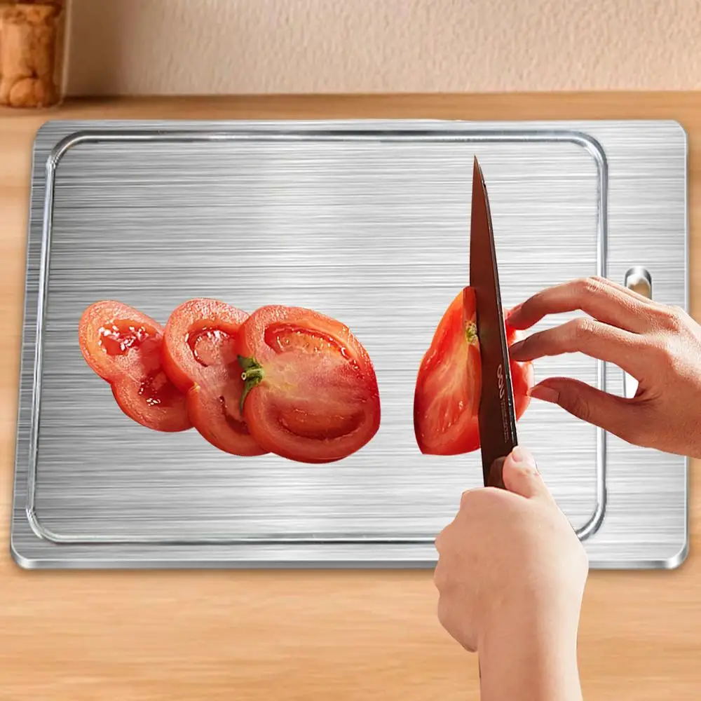 4.Safety and Firmness: Our stainless steel cutting board is designed with an advanced anti-slip mechanism that ensures stability and safety. Equipped with a secure non-slip base that firmly grips on any countertop, you can now prepare food with confidence and ease