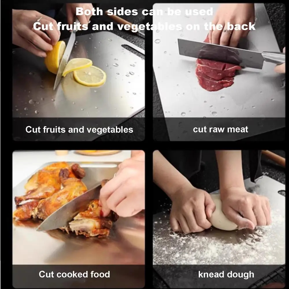 2.Useful Double-Sided Design: Our double-sided stainless steel cutting board caters to your kitchen needs with ease. Cut meat and fish on 1 side, and your favorite fruits and veggies on the other, thanks to its versatile functionality